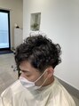 毛量が多く、横に広がりやすい髪は2ブロックで中を削ることで、パーマでの広がりを抑えてスタイリッシュにきまります。