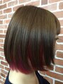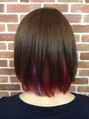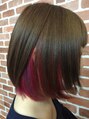 ピンク×パープルインナーカラーです。インナー部分は1ブリーチ後にピンクとパープル塗り分け。トップはカラーでアッシュ系。カットはレイヤーボブ でトップを下ろしてもインナー部分がチラッとみえるスタイルです。