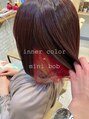 シンプルなミニボブの内側に可愛いピンクがチラリ☆ブリーチ履歴が1度ありましたが、根本がわりと伸びていたので、ケアブリーチを使用しました♪カラー剤に混ぜられるトリートメントも使ってダメージの少ない艶々の仕上がりを目指します!