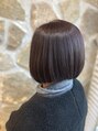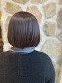 アゴラインの前下がりショートボブスタイル。コロンと丸いシルエットが可愛らしい王道スタイルです。カラーは艶感の出るピンクブラウン。白髪染めでもふんわり柔らかな印象になるのでオススメです。