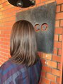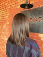 ブリーチでハイライトを全体的に入れ、上からアッシュベージュの8トーンで被せました。柔らかいナチュラルな色味にハイライトがチラッとアクセントになります。カットは鎖骨下の切りっぱなしに、毛先を馴染ませて軽くしました。