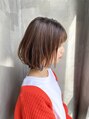 肩上の長さで設定したミディアムぱっつんボブ。カラーは淡いオリーブグレージュ。くすみカラーは色味を調節すると素敵な透明感が出ます!仕上げは毛先にワンカールの動きを出して柔らかい雰囲気に。とっても素敵なヘアスタイルだと思います!^^