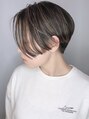 - ハンサムショートにハイライトを全体に入れた外国人風カラー。黒髪を活かしながらプラチナアッシュカラー。