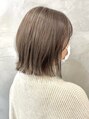 透明感たっぷりのミルクティーベージュ。やわらかい色味に◎ぷつっとボブとの相性もかわいいですよ~!ケアブリーチとトリートメントでダメージレスに。補色でパープルをミックスしているので、色落ち後も綺麗なカラーを楽しめます!