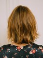 ミディアムロブの切りっぱなしスタイルで全体を軽くウエーブさせたナチュラルスタイルです。 カールよりウエーブにする事で縦の動きが出るので重たく見えず、バランスのとれたスタイルになります。 かきあげバングが大人らしいスタイルに☆