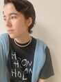 タイトにセミウェットに仕上げたショートスタイル質感を軽く、全体はくせ毛風パーマでニュアンス感をプラス