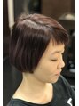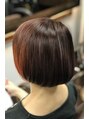 オーソドックスなグラデーションボブ、ワンレングスに近いグラボブなので、アウトラインやフォルムのバランス、面の艶感を意識してカットしました。カラーは全体はルビーヴァイオレット、左フロントだけブリーチをしてストロベリーレッドのマニキュアをオン