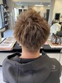 サイドは短めのツーブロック 前髪はサイド長めのアップバングにカラーはナチュラルなアッシュ系カラーに