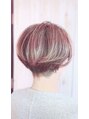 サイドと襟足がツーブロックのマッシュショートです。メンズライクなスタイルが好きな女性にオススメカラーはトップにハイライトが入っていてベースはピンクベージュです。