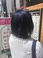 ブルーブラックです。切りっぱなしボブからの、ブリーチ一回の濃いめのブルーブラック。ヒカリに当たると、綺麗な発色になります。