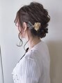 長めのおくれ毛をゆるっと下ろしたアレンジヘアです。ちょこっと付けると可愛いお花のオーダーも受け付けています♪お電話で宮本までお問い合わせください。