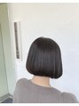 カットは、アゴ下ラインの重め内巻きボブ。カラーはくすんだアッシュの暗髪カラー。ツヤツヤ仕上げに髪質改善トリートメントがおすすめです。