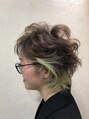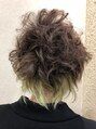 襟足、フロントサイドにブリーチして明るいグリーンを入れたショートスタイルです。少し左右フタイショウにしてあります。