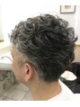 スッキリとツーブロックに刈り上げた耳回りとランダムパーマをかけて仕上げたスタイル。 襟足も刈り上げてタイトな印象に。 前髪も自然に立ち上げてトップにボリュームを出している。