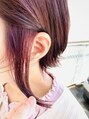 春らしい外ハネボブ。少しのレイヤーと、毛先を外ハネにする事によって動きを出し、コンパクトになりすぎないように!夏にはくくれる長さになるように。カラーはバイオレット系で、耳上から後ろの下を彩度の高いバイオレットでさりげないツートンカラーに。
