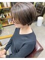 ショートスタイル。ベースのフェイスライン~トップ中心にハイライトをいれて動きを出しつつ、全体にミントアッシュでカラーリングして赤味抑ます。