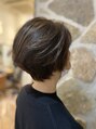 ミセスのショートスタイル。細かな白髪ぼかしのハイライトを入れ、スモーキーベージュをオンカラー。