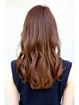 カールアイロンで動きを強めにつけたロングスタイルです。毛先と中間を32mmのアイロンで巻いて束が重ならないようにして動きをだしています。前髪は斜めに流れるようにスライドカットを用いて切り、カラーは明るい印象を与えるオレンジアッシュ。