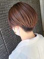 首まわりスッキリの前下がりスタイル、ハンサムショート!前髪は気分によってセンターやサイドで分け目を変えて楽しめるスタイルです!ほんのりオレンジ味のあるブラウンで夏先取りのカラー♪