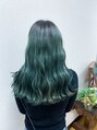 エメラルドグリーン根元を黒で残しながら、トレンドを抑えた青っぽさのあるグリーンにしました。ブリーチは最低1回で可能です。