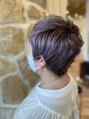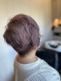 レディースのアシメショートスタイル。片方は耳を出しスッキリと、片方は長さを残しクシャッとスタイリング。カラーはブリーチ後ペールバイオレットをオンカラー。
