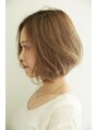 髪の色はアッシュベージュ系カラー。大きいカールのパーマが全体にかけてあります。ボリュームが出せてシルエットが整うのでお顔が小さく見えます。幅広い年代におすすめです!