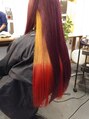 某人気アニメカラーです!トップはピンク系。インナーカラー、半分は黄色、毛先はオレンジ!!3色の派手髪です。
