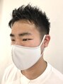 現役の陸上部のゲスト。小学生から大学に入っても陸上一筋。フレームが伸びてくるのが気になるようです。丁寧にハサミで刈上げをハードに施しました。トップはクセ毛ですので長さを残して、スライドカットで長短を付けて遊びを作りました。