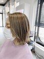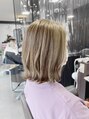 表面と顔まわりに白髪ぽかしのハイライトを入れ、12レベルのグレージュで柔らかさのあるハイトーンカラーにしました。