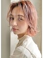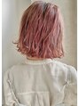 ピンクベージュの外はねボブ。ペールトーンのブリーチはブリーチ1回で濃い目に入れて色落ちを楽しむのがポイント透明感のあるカラーは動きのある外ハネと相性抜群