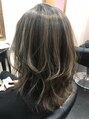 全体ハイライトしながらベースを暗めのグレージュで。シャンプー台で馴染ませてハイライト部分と全体を馴染ませると◎。長さは鎖骨下ラインのミディアムスタイルでトップはレイヤーを少しだけ入れて動きをプラス。