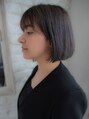 あごラインのぱっつんワンレングスボブに薄め前髪。カラーはブリーチ後、ラベンダーグレイッシュ系カラーをオンカラー。徐々に色味も変わるので褪色具合も楽しめるカラーです。長さが短いので毛先を内巻きに入れすぎないように!!