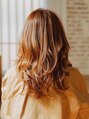 ハイトーンのロングスタイル。 前髪があるスタイルなので重たさが出ないようにカラーはオレンジ系のブラウンに。毛先にかけて明るくなるような自然なグラデーションになるようにしてあげるととても柔らかい印象になります