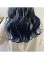ハイライト部分と毛先を2回ブリーチ後、濃いめのブルーをいれて立体感を演出。ブルーブラックとネイビーのコントラストがおしゃれ。ダメージが気になる方はケアブリーチがオススメです!