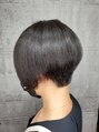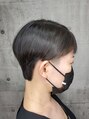 片耳側をツーブロックにして顔周りをシャープにしてもう片側をフェイスラインに合わせ長めに残し、前髪も短めの斜め前髪にした個性的で大人お洒落ミニマムヘアに仕上げました。お顔の形に合わせる事でスッキリ感もアップ!