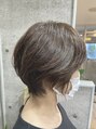 丸みがかわいいショートボブ。短くスッキリとした印象ですが適度に長さがあり柔らかさのあるスタイル。後頭部にボリュームがくるようにカットしているので絶壁解消にもなります。からーはN.カラーで柔らかいベージュにしています。