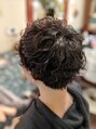 ツーブロックのマッシュ ヘアーに太めのロッドでスパイラルパーマをかけたソフトウェーブ ヘアー。