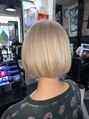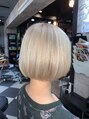 ベースはショートボブカット。襟足の収まりをよくするため少し刈り上げをしています♪カラーはブリーチ2、3回目安。シャンパンゴールドカラーでお洒落な金髪に♪♪