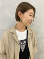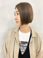 シンプルなアゴラインぱっつん前下がりボブ。カラーはハイライトをいれたベースにアッシュベージュをのせたナチュラルなカラーで陰影をつけ立体感を出しました。