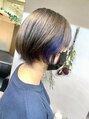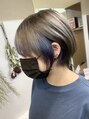 前髪からサイドにかけてフェイスフレーミングでブルー系の色味をアクセントにしたスタイル。それ以外の部分はシルバー系で色味をあわせてブルーが浮かないようにカラーを。耳にかけた時にしっかり色味が見えるように入れているのがポイント。