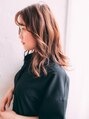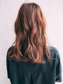 全体をゆるくウェーブにして、顔まわり、表面の毛束をミックスで巻いたセミロングスタイルです。バングを薄く短めにすることで、軽さとエアリー感をプラスしています。色は根元を少し暗めにして、グラデーションにすることで立体感をだしています。