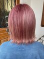 仕上がりのカットラインを綺麗に出すために、先に毛量調整をして、毛先をブラント気味にカット☆カラーはブリーチのリタッチをした後に、ピラミンゴカラーを薄くしっかり乗せて完成♪透明感のあるペールピンクが可愛いです☆