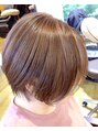 アジア女性に多い赤みオレンジ味を1度ハイライトブリーチを使い明るくした後でお好みのラベンダーベージュカラーをオンカラーした透明感あるカラースタイルです。カットは、色味の艶を活かした大人ショートヘアとなってます。お手入れ楽ちんです。