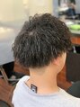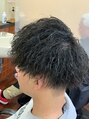 横後ろツーブロックで刈り上げ。全体マッシュベースでカット。少し強めのツイストパーマかけて、普段のスタイリングが楽に。何もしなくても、無造作感と束感が維持できます。