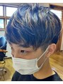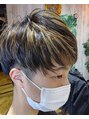 スタイル自体はツーブロックマッシュ。カラーは余計な色は、入れずブリーチハイライトのみをホイルワークを使った施術でビビット感があるショートマッシュにしてます。