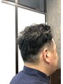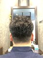 メンズはハチ部分の収まりでスタイルが出来上がります。ハチを抑え、トップにボリューム感を出し、三角形を作る事で頭が小さくなり動きも出やすいです!直毛の方はパーマを!くせ毛の方はカットで隙間を!