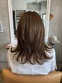 たっぷりのレイヤーで、軽さと動きをだしました。毛先は外ハネに巻くだけの簡単スタイリング。髪が多くて太いという方でも柔らかくみえるのでおススメです!