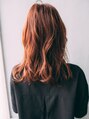 全体をゆるくウェーブにして、顔まわり、表面の毛束をミックスで巻いたセミロングスタイルです。 バングを薄く短めにすることで、軽さとエアリー感をプラスしています。 色は根元を少し暗めにして、グラデーションにすることで立体感をだしています。