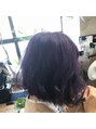 カラー(塩基性カラー)、シャンプーブロー。ブリーチ毛ベースで、塩基性カラーで、パープルに。