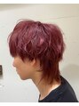 マッシュウルフは頭の形をよく見せることが出来るので絶壁の方にオススメです!長めの襟足が雰囲気抜群です◎光の当たり方で赤やピンク、紫など様々な色に見えるハイテクカラーです!濃い目の暖色系は色持ちも良いのでオススメです♪メンズヘア/マッシュ